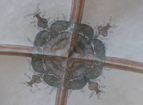 ukřižování, zazděný v severní stěně lodi, pochází z božích muk z roku 1444,