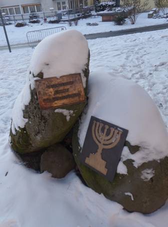 židovským symbolem sedmiramenného svícnu a textem „proti teroru, násilí a