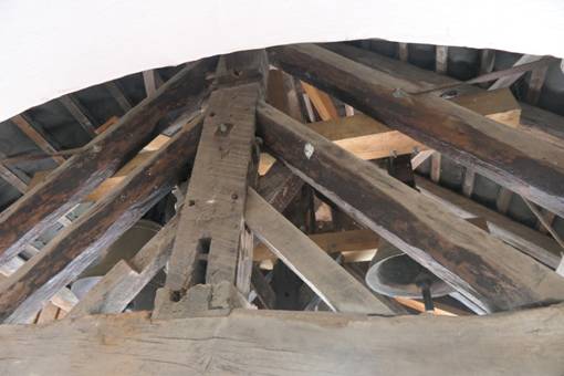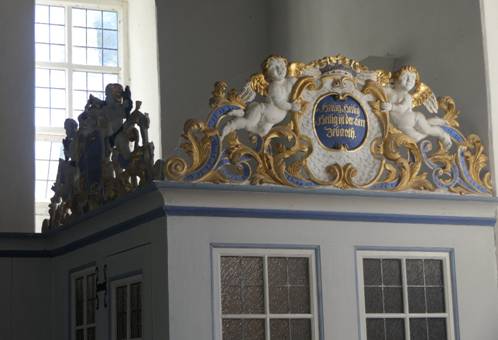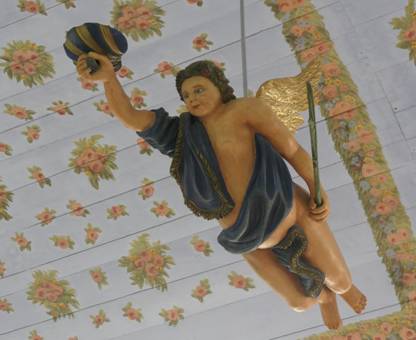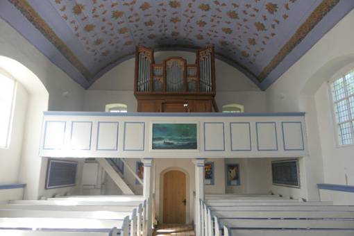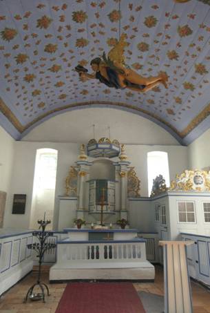 kostela – výmalba dřevěné klenby, zvaná „Růžové nebe“ od berlínského malíře Nikolause Niemeiera pochází
