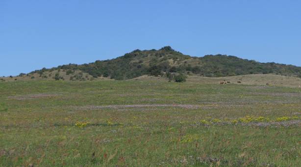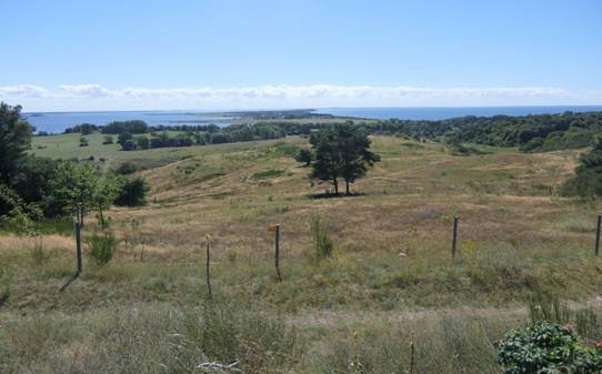 ledovcové morény porostlé částečně křovinatým lesem, částečně pastvinami, které
