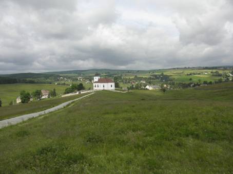 v jižní části vsi kostel se hřbitovem, ještě výše na samotě (dnes skrytý