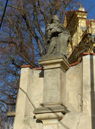 jihozápadním nároží ohradní zdi socha sv. Jana Nepomuckého (původně stála v